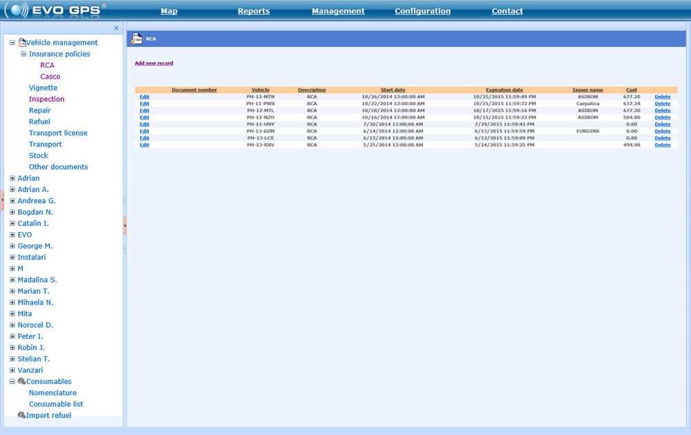 Management Section is a good tool to keep track of all paper work related to fleet management such as vehicle documents, licenses, repairs and maintenance carried out.